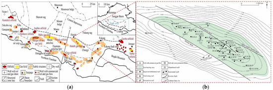 (a) Regional location of the Hutubi UGS (modified from Chen et al. [65]); (b) Well location distribution of the Hutubi UGS (modified from Zheng et al. [66]).