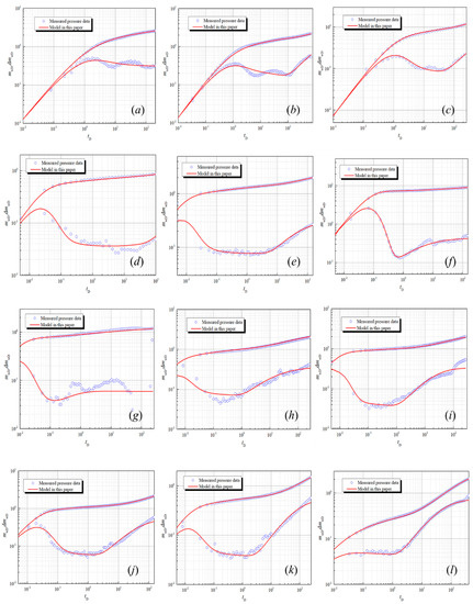 Three pressure monitoring methods have been applied to the Hutubi UGS, namely the permanent monitoring well, the direct monitoring for bottom−hole pressure, and the pressure transient monitoring [61,67]. The permanent monitoring wells in the Hutubi UGS include one well for caprock monitoring, nine wells for trap, and three wells for formation. The trap monitoring results show that the pressure fluctuates between 28.7 and 31.3 MPa. The small variation in pressure indicates that the gas storage is in a sealed state. The monitoring pressure inside the formation varies widely and is injection−withdrawal cycle−related. The pressure range during the 1–4th injection−withdrawal cycle is 14.6–30.8 MPa. Subsequently, the pressure tends to be stable, and the range is 22.3–32.9 MPa. In addition, the bottom−hole pressure of the injection−withdrawal well after 15 days of the shut−in period is selected as the direct monitoring result for bottom−hole pressure. The trend of pressure change is similar to the results of permanently monitored wells. The pressure range for the first four gas injection cycles is 19.9–34.0 MPa. For gas production duration, the range is 18.4–26.6 MPa. After the fourth injection−withdrawal cycle, the above two pressure ranges were updated to 29.5–34.2 MPa and 23.0–26.7 MPa, respectively. To evaluate the injection−production capacity of gas storage wells and the AFP, 127 pressure transient tests are also carried out during nine injection−withdrawal cycles. Gas injection and withdrawal testing times are 210 h and 240 h, respectively. The obtained testing pressure data were matched by the proposed model, and the balanced pressure values were obtained after a prolonged testing time. Compared with the direct monitoring results, the balanced pressure ranges during the 1–4th injection−withdrawal cycle changed by 4.3% and 3.5%, respectively. After the fourth injection−withdrawal cycle, the pressure ranges for gas injection and withdrawal are 2.3% and 2.2%, respectively. The transient pressure behaviors in Figure 9 show that the potential flow regimes in the Hutubi UGS include wellbore storage effect flow, skin effect flow, linear flow (for horizontal wells), pseudo−radial flow in the inner zone, transitional flow, and pseudo−radial flow in the outer zone. Different from the development of gas reservoirs, the large−scale injection−withdrawal rate in UGS leads to the obvious radial composite characteristics in pressure data. With the increase of the injection−withdrawal cycle, the derivative curve gradually rises, and the radial composite feature becomes obvious. The evaluated permeability distribution range is 16–55 mD. The skin factor and mobility ratio ranges are 0–5 and 2–6.2. The inner zone radius distribution ranges from 50 m to 300 m.