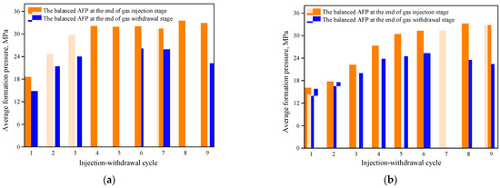 First, we collected the reservoir, fluid, and well properties of the Hutubi UGS in order to calculate the AFP. Subsequently, we collected the transient pressure testing data of 127 wells, the direct pressure monitoring data of 415 wells, and the permanent monitoring data of 13 wells from the Hutubi UGS. With curve matching of pressure transient testing data, the typical parameters, including permeability, skin coefficient, mobility ratio, and inner zone radius, can be obtained. The pressure solutions from vertical and horizontal wells in Equations (10) and (15) are obtained by the Laplace transform technology. The wellbore storage and skin effects are considered in the method of Mukherjee and Economides [44]. The balanced state pressure of a single well in the gas storage is obtained by prolonging the well shut−in time. The pressure superposition method in Equation (25) and the weighting method of the gas injection−withdrawal rate in Equation (26) are used to obtain the AFP. The weighting coefficient is related to the gas injection and production volume, and the weighting coefficient of Hutubi UGS is between 0.02 and 0.12. As shown in Figure 10, the balanced AFP for the Zi I layer at the end of the injection−withdrawal cycle increased rapidly from 18.7 MPa and 16.3 MPa in the 1st cycle to 32.1 MPa and 25.4 MPa in the 4th cycle. After the fourth period, the AFP tends to remain unchanged. The Zi I layer AFP for the injection−withdrawal cycle is finally stable at around 32.9 MPa and 22.2 MPa. For the Zi II layer, the final AFP values are 32.8 MPa and 22.4 MPa. The reason is that the gas injection volume of UGS at the initial stage is greater than the production volume to replenish formation energy. According to the AFP, for reservoir temperature and gas composition, Table 2 shows that the deviation factor in Equations (2), (27) and (28) varies from 0.93 to 1.02.