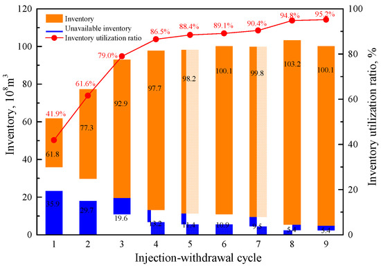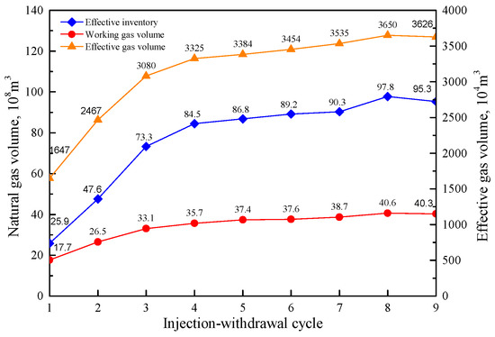 After completing the above steps, the evaluation parameters, including effective inventory, effective gas volume, and working gas volume, are obtained by Equations (21)–(23). The effective inventory, effective storage volume, and working gas volume in Figure 11 increase rapidly at the initial stage. After entering the fourth injection−production cycle, the increase rate of effective inventory, effective gas volume, and working gas volume slows down. After nine injection−withdrawal cycles, Figure 12 shows that the inventory of Hutubi UGS has increased to 100.1 × 108 m3 and the capacity filling rate is 93.6%. The inventory utilization ratio increased from 41.9% to 95.2%. The final effective inventory, effective gas volume, and working gas volume are 95.3 × 108 m3, 3626 × 104 m3, and 40.3 × 108 m3.