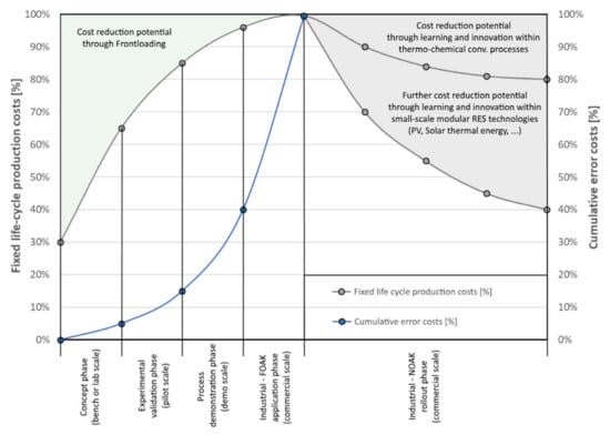 To achieve the proposed goals of climate neutrality by 2050 in the European Union, the development of novel environmentally friendly and innovative technologies must proceed quickly. The limited time leads to market competition within the renewable energy sector. On the one hand, the competition increases the efforts to develop novel technologies. On the other hand, the scale-up of novel, innovative energy technologies is often executed too early. Consequently, energy technologies that are not fully developed are scaled to the commercial and industrial scales without describing the full behavior of energy technologies with simulation models []. Since the physical plant is often better developed than the virtual representation, the same issues occur repeatedly. The solution to this problem can be the early evolution and implementation of virtual representations [] within the process development, called frontloading []. Similar to virtual product development [], early integration of virtual representations can help to save considerable time and money in the development process []. Furthermore, the virtual representations help to define ideal scale-up dates by determining and tracking milestones in the process development path. Figure 1 represents the cost reduction potential through frontloading and learning during process development. Therein, the theory of the increasing fixed production costs along the process development and the theory of learning and innovation in the technology rollout phase is combined []. By analogy with product development, it can be seen that about 65% of the production costs are defined in the conception phase [,]. Therefore, most of the energy production costs are determined within the conception phase by determining the input streams and process units. The early integration of virtual representations helps to compare different cost-effective process configurations []. Furthermore, development progress can be evaluated and validated by implementing virtual representations.