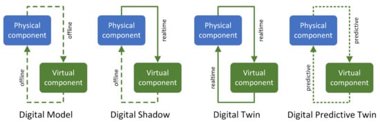 For classifying virtual representations according to the data exchange between virtual and physical facility, the level of integration is discussed. Kritzinger et al., introduced the level of integration to differentiate virtual representations according to their data communication []. Figure 2 shows the integration levels of virtual representations. Therein, it can be seen that the digital model is characterized by two-way offline data communication between the physical and virtual components. The digital shadow is defined by one-way offline and one-way real-time communication between the two components. In the literature [,], the digital shadow is exclusively characterized by real-time data communication from the physical to the virtual component. Since there are also applications with a one-way real-time communication in the other direction, the term “digital shadow” is also valid for this approach. Digital twins are characterized by two-way real-time data communication between the physical and the virtual components []. Aheleroff et al. [] extended the definition from Kritzinger et al. [] using a predictive model approach, which is motivated by the work of Tuegel et al. []. The term “digital predictive twin” is introduced, which defines virtual representations with integrated predictive models.