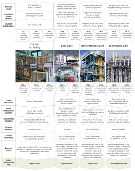 Besides the technology performance evaluation via sustainability indicators, the definition of process development stages is essential for developing novel energy technologies. Therefore, the technology readiness level (TRL), which was first introduced by NASA [], represents an important indicator for defining and monitoring the development progress. The TRL is also widely used within several national and international funding programs, such as EU Horizon 2020 [], to classify research projects. In Figure 4, TRLs with the appropriate realized infrastructure, investigated process behavior, and the expected results within each process development lifecycle are visualized. Refer to [,] for further information on the TRL and related topics. To achieve the expected results in each process development stage, it is important to monitor and accompany the process development lifecycle with virtual representations. The virtual representation should combine all findings from the experimental test runs in each process development stage. To enable a successful framework for virtual representations, the definition of a modeling readiness level is important.