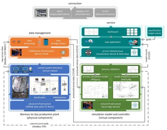 All these problems can be improved by applying the raised 5D virtual representation framework. The quasi-steady-state simulation model from Güssing [] was not suitable for condensing all lessons learned in a virtual model. Therefore, it is essential that the MRL is always one step ahead of the TRL to enable forward planning and anticipate future behavior. Furthermore, the virtual representation should always be able to process and reproduce gained knowledge from test runs. This would help to avoid recurring technology issues. To tackle the described issues, the research project ADORe-SNG [] has been initiated to develop a virtual representation of the Bio-SNG route at a pilot scale. A digital predictive twin was developed to optimize the pilot-scale Bio-SNG production route. In Figure 6, the virtual representation framework for the digital twin use case of the Bio-SNG production route is visualized.