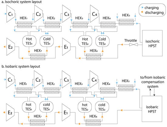Schematic diagram of the ACAES systems. (a) Isochoric—the air leaving the HPST is throttled to the minimum storage pressure. (b) Isobaric air storage is maintained so no throttle is included.