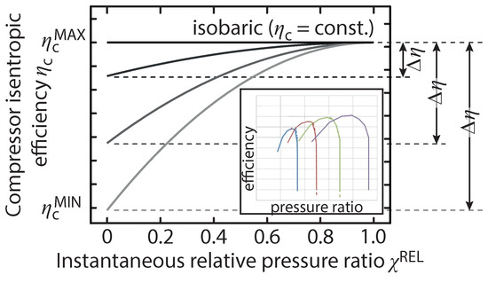 Here, is the instantaneous compressor isentropic efficiency, is the relative efficiency difference between operation at the minimum pressure ratio and the maximum pressure ratio over the efficiency at the maximum pressure ratio ().