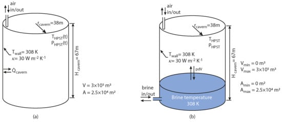 The cavern is assumed to have cylindrical geometry, with constant wall temperature and convective heat transfer coefficient . The cavern internal temperature ( K) indicates a mid-point depth around 550 m [17]. (a) Cavern arrangement in the isochoric configuration, wherein volume and surface areas are constant, whilst pressure and temperature are variable. (b) Cavern arrangement in the isobaric configuration where pressure is maintained by changing the available air storage volume.