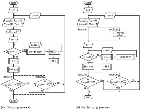 Finally, the model implementation algorithm is schematically depicted as flowcharts in Figure 5a,b, for charging and discharging processes, respectively. The internal algorithm routines for compressors, heat exchangers, expanders, air storage and TES follow the equations presented in Section 2.1, Section 2.2, Section 2.3, Section 2.4, Section 2.5, Section 2.6 and Section 2.7.