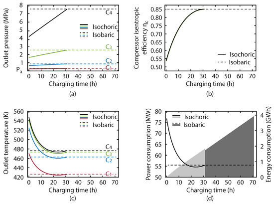 The results of the variable pressure on the charging process of the isochoric store are shown in Figure 6. In Figure 6a, we see the evolution of the compressor outlet pressures in both systems. The effect of the variable pressure is clear as the pressure at the compressor outlets in the isochoric system rises, reaching the maximum value when the system is fully charged. This maximum value is maintained by the isobaric system throughout the operation. The absolute value of the compressor outlet pressure change is smaller in the lower stages. As shown in Figure 6b, the compressor efficiency drop is much more significant at earlier times, and increases rapidly as the charging process takes place. This is due to the shape of the efficiency function as given in Equation (9), which is typical of a compressor map, and shows an increasing performance drop as you move further from the design operation. It is interesting to note the combined effect of the increasing pressure ratio and the efficiency as shown in Figure 6c. Here we see that the compressor outlet temperatures in the isochoric system start at their maximum, when the inefficient compressor operation dominates, before falling rapidly and reaching a temperature level below the isobaric configuration when the compressor efficiency is high and the pressure ratio is just below the level in the isobaric system. Figure 6d shows the evolution of the charging power and the energy stored.
