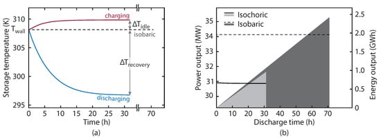 Composite plot depicting: (a) storage temperature variation during the isochoric system charging and discharging periods (red and blue lines, respectively), as well the constant isobaric system temperature throughout charging and discharging. Additionally, the difference between final charging and initial discharging temperatures corresponds to the idle period temperature drop (), whilst the opposite corresponds to the recovery period temperature increase (). (b) power generation (left, lines) and cumulative energy generation (right, shaded areas) during the discharging period for both systems. Note the isobaric scenario runs for longer than the isochoric. Data generated for .
