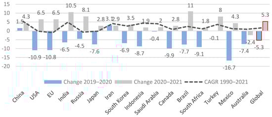 In 2021, global CO2 emissions returned to the pre-pandemic level of 2019, increasing immediately by 5.3% compared to 2020 (China and Iran, despite COVID-19 restrictions, increased CO2 emissions in 2020 as well). The highest growth in emissions in 2021 came from India (+10.5%) and Brazil (+11%). Brazil, India, Russia, Turkey, China, Iran and Saudi Arabia emitted more CO2 in 2021 than in 2019. Australia was the only country that maintained the trend of reducing CO2 emissions in 2021, there was a decrease of 2.4%. The EU, Russia, the USA and Japan showed the CAGR of CO2 emissions compared to 1990. At the same time, more than 60 countries (the UK, the EU, the USA, China, Japan, etc.) announced that they will achieve “carbon neutrality” by 2050–2060 and even earlier. The fulfillment of the tasks set requires system-wide transformations, and various deterrent and incentive tools. Incentive tools contribute to certain behavior patterns, such as tax incentives and preferences for alternative energy sources—RESs. Although individual studies show that tax incentives may not have the desired effect, both for one country [22] and a group of countries [23], their scale can be quite impressive. In some countries, lost revenues from tax incentives amount to more than 13% of GDP [24]. Thus, the dynamics of greenhouse gas emissions are not uniform in different countries.
