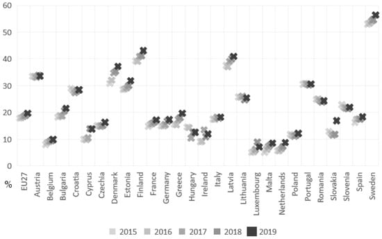 The indicators of the EU countries are quite heterogeneous in terms of the share of renewable energy sources, with 15 countries showing an indicator below the average (19.7% in 2019). The largest share of RESs is observed in Sweden (56.4% in 2019). Sweden is a world leader in decarbonization, with a goal of achieving “zero” emissions by 2045. This is followed by Finland (43.1%), Latvia (41%), Denmark (37.2%), Austria (33.6%), Estonia (31.9%), Portugal (30.6%), Croatia (28.5%), Lithuania (25.5%), Romania (24.3%), Slovenia (22%), Bulgaria (21.6%) and Greece (19.7%). Most countries progressively increased the share of RESs in transport, electricity, heating and cooling, with the exception of Austria (2015—33.5%, 2016—33.4%, 2017—33.1%, 2018—33.8%, 2019—33.6%), Greece (decrease in 2016—15.4% compared to 2015—15.7%, then growth), the Netherlands (decrease in 2016—14.4% compared to 2015—14.5%, then growth), Ireland (decrease in 2018—10.9% compared to 2017—13.5%, then growth), Italy (2015—17.5%, 2016—17.4%, 2017—18.3%, 2018—17.8%, 2019—18.2%), Latvia (decrease in 2016—37.1% compared to 2015—37.5%, then growth), Lithuania (2015—25.8%, 2016—25.6%, 2017—26%, 2018—24.7%, 2019—25.5%), Luxembourg (decrease in 2019—7.1% compared to 2018—9.0%), Portugal (2016—30.9%, 2017—30.6%, 2018—30.2%, 2019—30.6%), Romania (2016—25%, 2017—24.5%, 2018—23.9%, 2019—24.3%), Slovenia (2015—22.9%, 2016—22%, 2017—21.7%, 2018—21.4%, 2019—22%) and Spain (2017—17.6%, 2018—17.5%, 2019—18.4%). The most significant increase in the share of RESs in 2019 was shown by Slovakia (+5% to 16.9%), the most significant drop was in Luxembourg (−1.9% to 7.1%) and this is the lowest share of RESs among the EU countries.