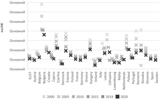 At the same time, the reduction in the specific energy consumption slowed down (−1%) globally in 2021 compared to the average value for 2000–2019 (−1.5%) [36]. Figure 3 presents the energy intensity of the EU economies, which is understood as the ratio between the gross domestic energy consumption and GDP, calculated for a calendar year.