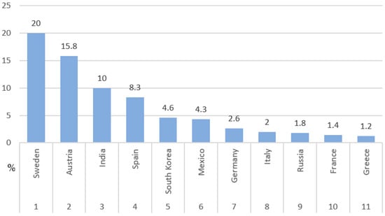 Ranking countries by estimating the share of tax expenditures for increasing renewable energy sources and improving the energy efficiency in total tax expenditures for environmental sustainability identified the leading countries: Poland, Germany, Sweden and Italy (for the first indicator) and South Korea, Ireland and Finland (for the first indicator). The results obtained can be explained by two reasons. The bottom-ranked countries, while providing tax incentives for environmental sustainability, do not focus only on the energy sector, using various types of tax expenditures, for example, biodiversity conservation, reduction of greenhouse gas emissions, support for climate change adaptation, etc. The leading countries have a wide range of tax benefits and preferences. For example, Polish tax legislation provides for a reduction in the property tax for wind farms. In addition, tax incentives to encourage renewable energy sources in Poland include exemption from the agricultural tax and exemption from the excise tax on electricity produced using renewable energy sources [44]. One component of tax expenditures for the energy efficiency in South Korea is a tax credit for investments in energy-saving facilities. The tax credit is provided for the purchase of appropriate new facilities and equipment to achieve energy savings and it is 1% for large companies, 3% for medium-sized companies and 7% for small and medium-sized enterprises.