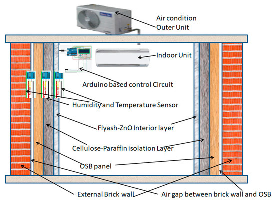 Researchers have been working to develop smart concrete composites to protect constructions as well as maintain the health of living and non-living bodies. Researchers are still working on the development of smart concrete composites to protect constructions [18,19,20], which will also help in controlling room temperature, moisture, and so on, mitigating any damage to non-living things or the health of human beings. The proposed work is a simulation study using ZnO–fly ash composite as a smart sensing material. The simulation work was carried out using COMSOL multiphysics software. The simulated environment performance analysis is based on thermal and hygric simulation [21]. It is predictable that hygrothermal simulations can help in analyses of the overall performance of buildings [10,11,14,22]. This study investigates the hygrothermal performance of building components, which are the fly ash–ZnO nano composite as the interior sensing layer of relative humidity, cellulose phase change material as the insulation layer with wood supporting the partition board, and concrete wall structures verifying the humidity level in the various building layers. The remainder of this paper includes the background of the study with proper justification for finding day-to-day problems, with a proper simulation design proposed, followed by the results and discussions. The data acquisition system with the overall instrumentation and control of the proposed research work is depicted.