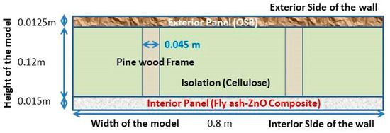 Wall structure: Under a given climatic condition, the moisture performance of the wall construction system is over-reliant on the system consonance, as well as the thermal and moisture characteristics of the constituent elements. Under Indian climatic conditions, moisture characteristics of wood and concrete wall structures are scrutinized. The exterior wall is a brick wall made of cement. The false wall is made of pine-wood-based OSB attached to the conventional brick wall. The isolation board is made from cellulose, with a bracing made of a wooden panel and interior siding made of fly ash–ZnO composite.