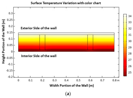 The designed model is affected by temperature. The thermal conductivity is highly dependent on the water content and temperature. Figure 4a depicts the temperature variation from the outer side to the inner side of the wall. The temperatures in the OSB and sensing layer are 35 °C and 24 °C, respectively. The temperature change occurs as a result of the cellulose-based insulation layer. The COMSOL multiphysics proposed model clearly depicts the temperature variation at each point of the false partition.