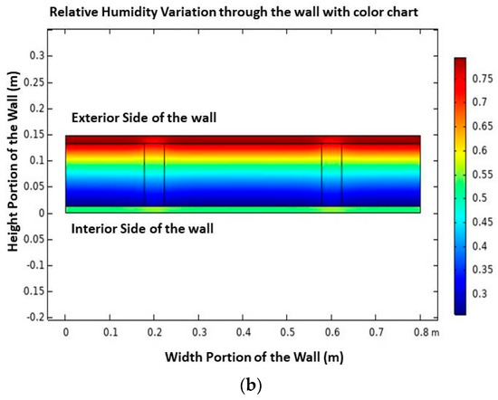 Two-dimensional cross-sectional view: (a) surface temperature variation and (b) relative humidity through the wall structure.