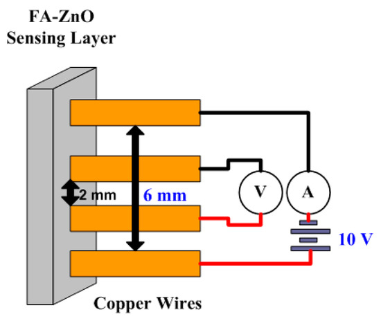 To sense the change in humidity due to temperature, sensor arrangement is necessary for the protection of both construction elements and human health. The proposed fly ash (FA) and zinc oxide (ZnO) composite is used as an interior panel of the wood-frame wall to replace gypsum board. For the experimental setup, the proposed composite has undergone various processes to form a pallet-like structure. FA–ZnO powder was ground thoroughly using polyvinyl acetate (PVA). In this process, PVA acts as a binder. By applying 6 tons of pressure in the palletizer, the PVA was mixed with FA–ZnO powder for 8 min. Cylindrical-shaped pallets are then formed after the prescribed time. The cylindrical-shaped pallets are then ground using a micro sand grinding machine to form square-shaped plates. For testing purposes, FA–ZnO square sheets were used with a height of 0.003 m and area of 0.000078 m2, respectively. The resistivity of the FA–ZnO composite was calculated using Equation (1).