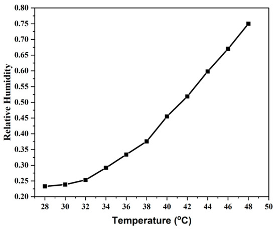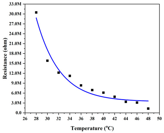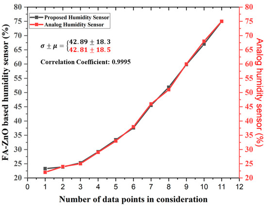 The maximum fractional change in resistivity of the material is 22.37. The temperature, resistivity, and resistance of the sample are measured successfully, but the relative humidity of the sample can only be measured by the analog hygrometer implemented on the FA–ZnO sensing layer. The corroboration with environmental temperature is depicted in Figure 8. It shows that the increase in temperature increases the relative humidity by decreasing the resistance value of the sample, as depicted in Figure 9. The resistance is measured continuously using an arduino microcontrolling unit. The change in relative humidity base value from 0.25 to 0.75 is monitored experimentally using FA–ZnO composite as sensing material. For composite samples, as the resistance value lies between MΩ, it can be measured with an LCR meter. The output data values from both the proposed FA–ZnO nano-composite-based humidity sensor and commercially available analog humidity sensor are corroborated and depicted in Figure 10. In the Figure 10, we have used two sets of data likely proposed and available humidity sensor values. The data values of proposed humidity sensor are having a correlation value of 0.9995 with commercial humidity sensor. The sensor values both proposed and commercial are not only correlated but also verified their distribution over large sensing range. The mean and standard deviation between proposed and available humidity sensors are 42.89 ± 18.3 and 42.81 ± 18.5, respectively. The large standard deviation is the feature of the quite spread-out data, which is observed due to the large variation of temperature value (i.e., from 35 °C of outer wall to 28 °C on inner wall) as moving from the outer wall to inner wall.