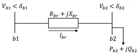 Consider the single-line diagram of a simple two-bus radial distribution system depicted in Figure 2. Radial distribution systems use series impedances to represent power distribution lines and constant loads to establish a symmetrical system. The power flow solution for such networks may be computed by using Equations (1)–(3).