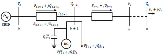 The power flow for the radial distribution networks incorporated with DG–capacitor units in Figure 3 can be computed using Equations (7) and (8). The active and reactive power flows at the terminal node of the branch can be mathematically stated as