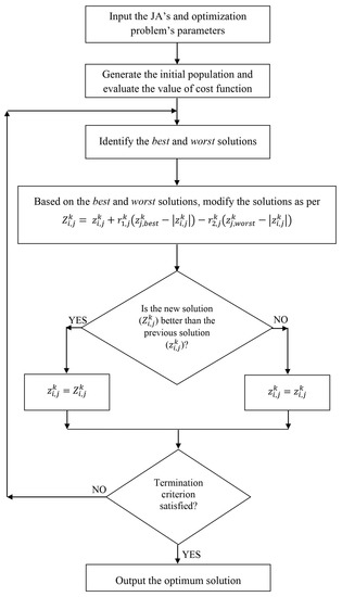 To mathematically describe the JA’s implementation cycle, let z be the real valued vector of decision variables composing one solution. The and indicate the best and worst so far solutions. The candidate’s jth decision variable in the iteration is represented as . Then, at the iteration, the numerical equation used to update the candidate solution is given as represented in Equation (23).