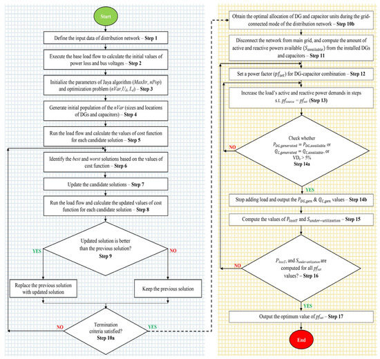 It is worth recalling that the distribution networks operate in grid-connected mode except when the grid has a fault or is being maintained. For this reason, the sizing and placement of capacitors and DGs must be chosen considering a grid-connected operation. Therefore, the first part of the proposed methodology is to obtain the optimal capacity and placement of the DGs and capacitors for grid-integrated distribution networks. In order to determine the optimal location and sizing for the DG and capacitor units, the Jaya algorithm (JA) was used. The JA, developed by Rao [51], is a stochastic heuristic optimization algorithm that only involves a single recombination step. In addition, the JA is different from most population-based optimization approaches as it uses no parameters, chosen by the user, in its execution. Only the maximum number of iterations (MaxItr) and population size (nPop) are to be specified for the JA [52,53]. In the recent literature, the efficiency of the JA has been demonstrated in various studies [54,55,56,57,58].