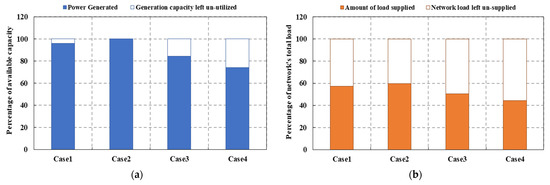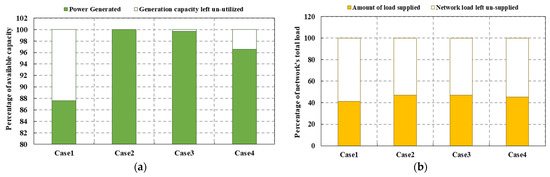 Performance comparison of the 33-bus autonomous distribution network at different pfsource. (a) Installed power generation capacity’s % utilization and (b) network’s % load share delivered with accessible power.
