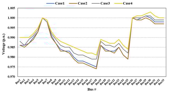 The findings illustrate that keeping the DG–capacitor combination’s power factor close to is the most efficient approach to operate the islanded distribution networks. The value can be computed from the DG and capacitor’s optimal ratings obtained during the grid-integrated network operation. At this power factor, both the DG and capacitor supply power to their full potentials. It can be seen from the results that the operating efficiency of the islanded distributed network achieved in cases 3 and 4 is marginally higher than that obtained in cases 1 and 2 because the mounted active and reactive power-generating components are not utilized to their full capability in the latter two cases. Therefore, the reduced power flows through the distribution lines cause a considerable reduction in power loss. While these cases have lower power losses than cases 1 and 2, the difference is insignificant compared with the additional power delivered by the mounted units in the first two cases. In addition to the distribution network’s operating efficiency, the impact of the DG–capacitor pair’s operational power factor on the voltage profile of the islanded distribution networks has also been analyzed, as shown in Figure 8. Since the distribution network is less loaded in cases 3 and 4 due to the opted values, the bus voltages attained for these cases show a modest enhancement. In four cases, the minimum bus voltages for the 33-bus islanded network were recorded at bus 18, ranging from 0.974 to 0.981. Despite the fact that the power grid was not feeding energy during the islanded operation, the bus voltages remained within the defined limits even when the mounted devices were fully loaded. This is owing to the optimum DG and capacitor positions attained during on-grid operation, with the DG located at the central position of bus 6 and the capacitor’s placement at bus 30 near the end point buses, which allows the voltage to be maintained within a set margin (i.e., ±5% of ) on the weakest buses. Furthermore, even though the installed power-generating units can carry more load, the proposed strategic approach’s operating mechanism prevents the islanded network from being loaded beyond the limit that drops the voltage below the predefined margin, as specified in step 14 of Section 3. For this reason, the end buses (buses 18, 25, and 33) have voltages that are well within the operational limits, as seen in Figure 9.
