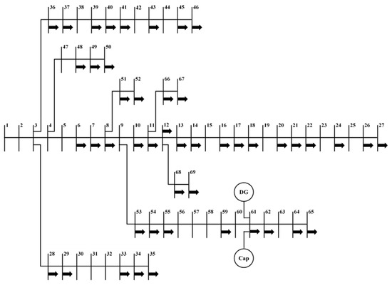Because of the greater line resistance to reactance ratio, high current flows, and radial configuration, the distribution system is the most unreliable. It has the highest power losses among the three components of the power system: generation, transmission, and distribution [46]. It has been noted that about 13 percent of the total generated power is wasted as the real power loss () in the distribution networks [47,48]. As per the statistics, the distribution system is responsible for over 70 percent of the total power system losses [49]. According to the study [50], these losses range between 33.7 percent and 64.9 percent. In this condition, the inappropriate selection of the DGs and capacitor sizes and locations will further add to the system losses. Therefore, this study’s first objective is to minimize the power loss with simultaneous DG and capacitor placements.