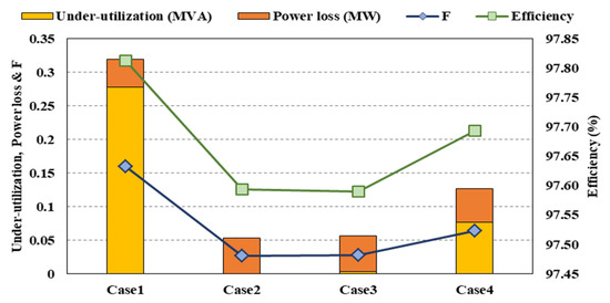 The observed efficiency (%), under-utilization (MVA), power losses (MW), and objective function (F) values in four cases for 33-bus autonomous distribution network.