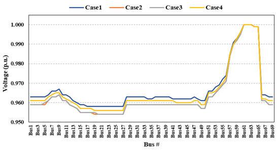Conversely, for the 33-bus and 69-bus independent distribution networks, the highest power losses were produced at the power factors close to the pfsource. Undoubtedly, this is because of the maximum power that flows at the pfsource values. The graphical illustration of the obtained results in the studied four cases for the 69-bus autonomous distribution network is presented in Figure 12. In addition, the graphical illustration of the network’s voltage profiles obtained in four cases is presented in Figure 13. The voltage profiles show that the voltages at bus 61 and neighboring buses lie close to the rated value of 1 p.u., which are due to the DG and capacitor units’ allocation at bus 61. In addition, because of the tactically placed DG–capacitor modules and proposed mechanism of the methodological framework, the voltage profiles lie within acceptable bounds in all cases, even if the DG–capacitor operates to its full capacity. Unlike the 33-bus distribution network, where the lowest voltage value was observed at a single bus, the minimum bus voltages for the 69-bus islanded network were observed across several buses (from bus 17 to bus 27), ranging from 0.954 to 0.958 in four cases.