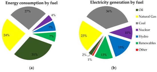 (a) Global energy consumption by fuel source and (b) global electricity generation by fuel type (source, BP Energy Statistics 2022 [1]).