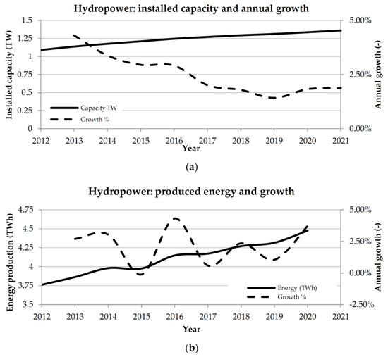 The role of hydropower has been constantly increasing over the years. Indicatively, as shown in Figure 2, the recent trend both in terms of installed capacity and produced energy per year shows an annual growth of 1.8% and 2.3%, on average for the last 2–3 years, respectively. Despite the minor drop in annual growth of installed capacity for the year 2019 and, given the goal for a Net Zero Emissions by 2050, hydropower is expected to maintain an average annual generation growth rate of about 3% in 2022–2030 [3]. The growing role of hydropower is justified for two main reasons:
