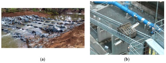 Figure 4. (a) Rock–ramp fishway, (b) fish lift at Tallowa dam.