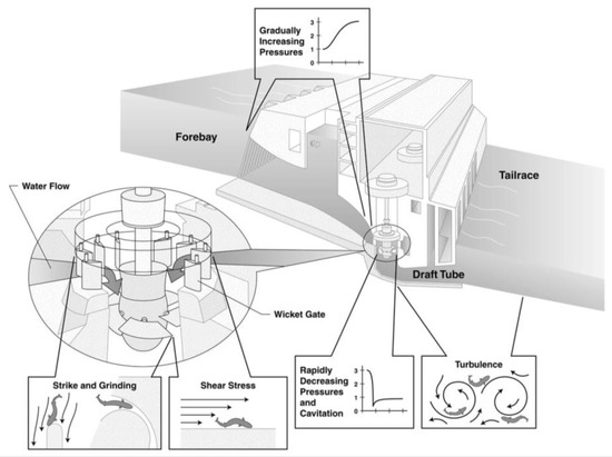 In order to define criteria for the design of fish-friendly turbines, it is necessary to identify the mechanisms relevant to fish damage. Such mechanisms have been identified since the early 2000s, in an effort to improve designs, provide guidelines and develop novel turbine concepts with minimum effect on passing fish. In particular, several critical damage mechanisms have been identified [24,42,43,44], which are presented below, following the flow direction from the inlet racks toward the draft tube (see also Figure 6).