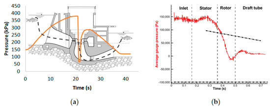 As a passing fish moves through the turbine intake, through the turbine, the draft tube and finally downstream the tailrace, it experiences severe pressure changes. After the racks and inside the penstock, pressure gradually increases, due to hydrostatic pressure [46]; an indicative of such variation is shown in Figure 7a; however, depending on the elevation change, this can be in the order of 1 bar to more than 10 bar. Then, at the vicinity of the stator blades, and especially the runner, pressure drops rapidly, much faster than the pressure rise. Gauge pressure can drop even below zero (vacuum), near the suction side of the blades [47,48], or the spiraling vortex tube, also known as vortex rope in the relevant literature, emanating from the turbine hub [40,49]; indeed, the latter is well known to induce strong low-frequency vibrations to the whole turbine, which potentially threaten the integrity of the whole installation [50,51,52,53]. In any case, as the trajectory of a passing fish reaches the tailrace, pressure recovers gradually to near atmospheric conditions.