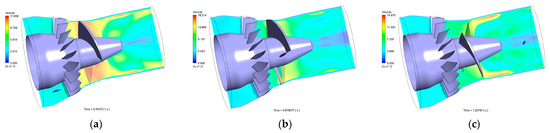 Indicative sequence of an ellipsoid body (the dark blue ellipse), tracked with immersed boundaries, in an axial flow turbine (for more details refer to [105]). Time instances (a) 0.45 s, (b) 0.87 s and (c) 1.21 s.