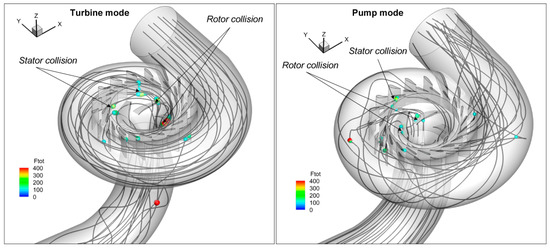 Trajectories and observed collisions of fish for different starting positions for a fish-friendly Deriaz-type turbine [109], at turbine mode (left) and pumping mode (right). Colored spheres indicate the forces above 10 N, corresponding to collisions.