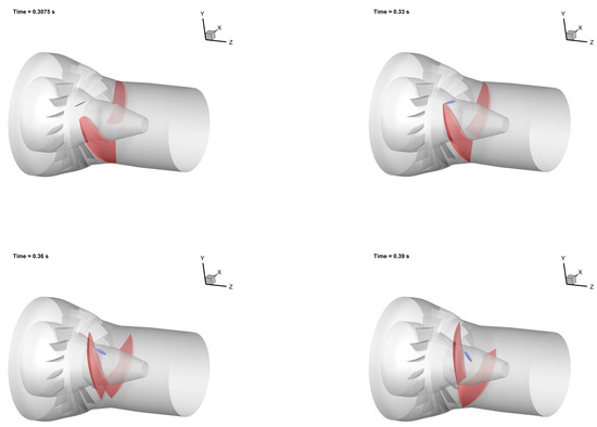 A recent variant [108] to the more computationally expensive 6-DoF techniques decouples the flow field from the body tracking. This decoupling makes it possible to solve the flow field with steady-state moving reference frames, which greatly speeds up the solution by roughly two orders of magnitude, allowing for the derivation of statistics (see indicatively Figure 10, where a specifically designed reversible, fish-friendly Deriaz turbine [109] was tested). Since the flow is decoupled from the body motion, the pressure field around the moving body is approximated through the dynamic pressure of the slip velocity. Pressure can be integrated to calculate forces and torques acting on the body. External forces from collisions with rigid boundaries (blades, draft tubes, etc.) can also be taken into account (indicatively, see Figure 11, where an ellipsoidal fish model collides with the rotor of an axial turbine, causing it to tumble).