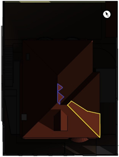 Figure 2 presents the result of the simulation of the shading effect on the infrastructure roof during one year of analysis. The area outlined in yellow corresponds to the useful area of the roof that is not affected by annual shading, and the zone delimited in blue, due to its reduced area, will not affect the generator. Due to the limitations of the Autodesk Revit 2022® programme, the area outlined in yellow is 12 m, which corresponds to an approximated value.