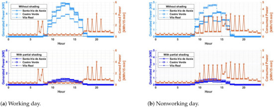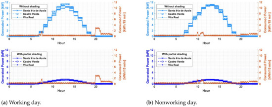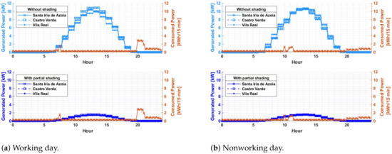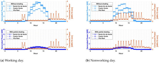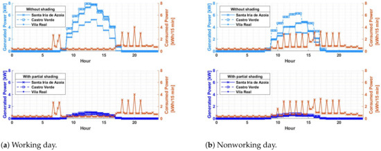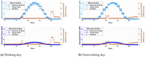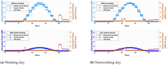 Total or partial shading on photovoltaic systems will always occur. It is simply unavoidable. Figure 3, Figure 4, Figure 5, Figure 6, Figure 7, Figure 8, Figure 9 and Figure 10, verify through the production curves that during partial shading the system cannot meet demand in most of the time intervals in all locations under analysis and with photovoltaic technologies used. This implies that the investor will have to use energy from the grid. The production of surplus energy occurs mainly on working days, due to the reduced demand and increased production during sunny hours. However, the amount of surplus energy does not make up for that lost through shading scenarios.