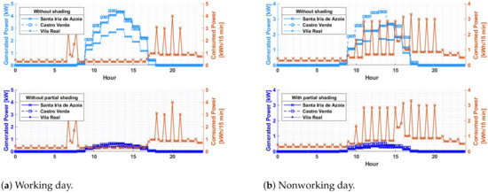 Note that there is a discrepancy in production according to the place under study due to varying atmospheric conditions. These affect the performance of solar technologies. Note also that the maximum generated power using modules from emerging technologies is lower than the maximum production when traditional technologies are used. Finally, the generation curves with partial shading present lower values when compared with the generation curves without the shading effect, and in some instances, the generation curve is not able to cope with the load.