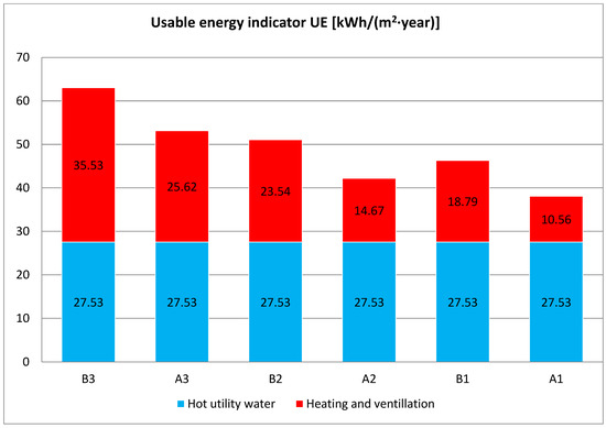 Energy analyses were performed for a building of a different energy class regarding usable energy and are presented in Scheme 1. When considering the balances of annual demand for usable energy, the highest indicator of demand for usable energy for heating and ventilation occurs in the case of a building with natural ventilation and with typically designed external partitions. The indicator of annual demand for usable energy EUH for this is 35.53 kWh/(m2·year). The high value of EUH indicator of demand for usable energy for heating and ventilation suggests high energy consumption of the designed building. The lowest demand for usable energy for heating and ventilation occurs in the case of a building with mechanical supply and exhaust ventilation with heat recovery, with designed external partitions, meeting the requirements of buildings with passive energy characteristics. The annual demand for this usable energy is 10.56 kWh/(m2·year). A facility designed with such principles in mind is a building that is able to achieve the zero-energy standard. It should be noted that the demand for usable energy for the preparation of hot utility water for all the variants is 27.53 kWh/(m2·year). Depending on the energy class of the building, the demand for usable energy for the preparation of domestic hot water can vary from 43% to 72% of the total demand for usable energy in the building.