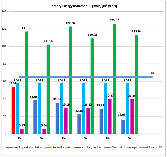 Scheme 5 shows the total demand for primary energy for the respective energy classes of the building when supplied with heat energy from the heat pump. The primary energy indicator ranges from 40.49 kWh/(m2·year) to 63.90 kWh/(m2·year). For the respective energy classes, when a heat pump and a PV installation are used as a heat source, the requirements of the maximum FE indicator according to the technical conditions are met [6]. The analysis shows that the lowest demand for primary energy occurs in the case of a building with natural ventilation and partitions with increased thermal insulation. The downside of natural ventilation is the lack of sufficient impact on the efficiency and purity of the ventilated air.