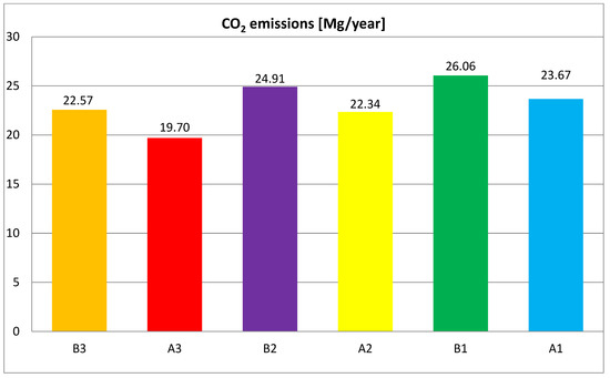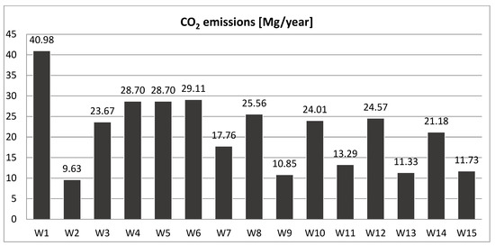 The environmental analysis carried out for the purposes of this article consisted in the assessment of CO2 emissions into the atmosphere for 15 analyzed heat sources applied for heating purposes and preparation of domestic hot water, including energy for the operation of auxiliary devices (Scheme 10). The lowest CO2 emission occurs in the case of a building supplied with heat from a biomass–pellet boiler (variant W2) and a building using heat pumps as energy sources combined with photovoltaic PV installations. In the case of buildings equipped with biomass boilers, it must be borne in mind that there are legal restrictions on use of biomass in cities and health resorts. The most negative impact on the environment occurs in the case of heating buildings by means of solid fuel boilers running on hard coal. Heating systems based on heat substations supplied by centralized heat are also characterized by high emission rates. This is due to the fact that, in Poland, a large part of heating or cogeneration systems rely on hard coal. Heating systems supplied by electricity from the power grid are characterized by high emissions. The reason is that the Polish power industry, in which fossil fuels are still main energy carriers, is characterized by low energy efficiency.