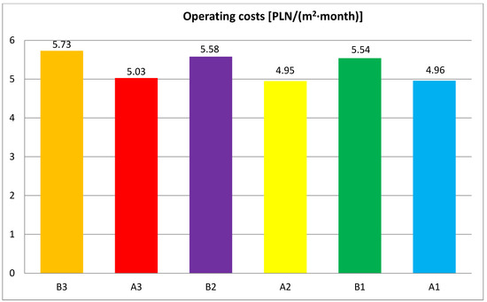 An economic analysis comparing operating costs related to heating, preparation of domestic hot water and the operation of auxiliary devices was also performed. Scheme 7 presents the results of the economic analysis. It shows that significantly lower operating costs are incurred in the case of designing partitions with increased thermal insulation that meet the requirements for buildings with passive energy characteristics. It was noted that the lowest operating costs are generated for a building with mechanical exhaust ventilation and with designed external partitions, meeting the requirements of buildings with passive energy characteristics.