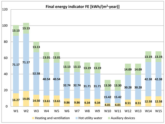For the analyzed sources of heat and energy as well as energy carriers, indicators of demand for final energy were determined, taking into account the efficiency of heating systems and the demand for energy consumed by auxiliary devices. Scheme 8 presents the results of the analyses which reveal that the lowest final energy indicator FE occurs when a highly efficient glycol–water heat pump is used (variant W10 and variant W11). Systems based on solid fuel sources—hard coal and biomass—pellets (variant W1 and variant W2) are characterized by the lowest efficiency.