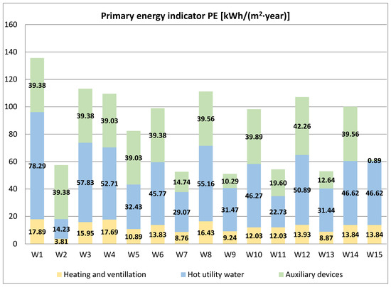 In the case of demand for non-renewable primary energy PE (Scheme 9), the lowest indicators are in the case of using high-efficiency heat pumps as a source of heat, additionally supplied by a photovoltaic PV installation (variants W6, W7, W8, W9, W10, W11, W12, W13) and in the case of using a biomass boiler (variant W2) as a source of heat for heating purposes and preparation of domestic hot water. For the above-mentioned variants based on renewable, alternative heat sources, the requirements for primary energy demand indicators are met according to the technical conditions [13]. For heat sources based on fossil fuels such as hard coal or natural gas, the maximum indicators of primary energy PE are exceeded, which excludes them from use in Poland in view of the legal considerations.